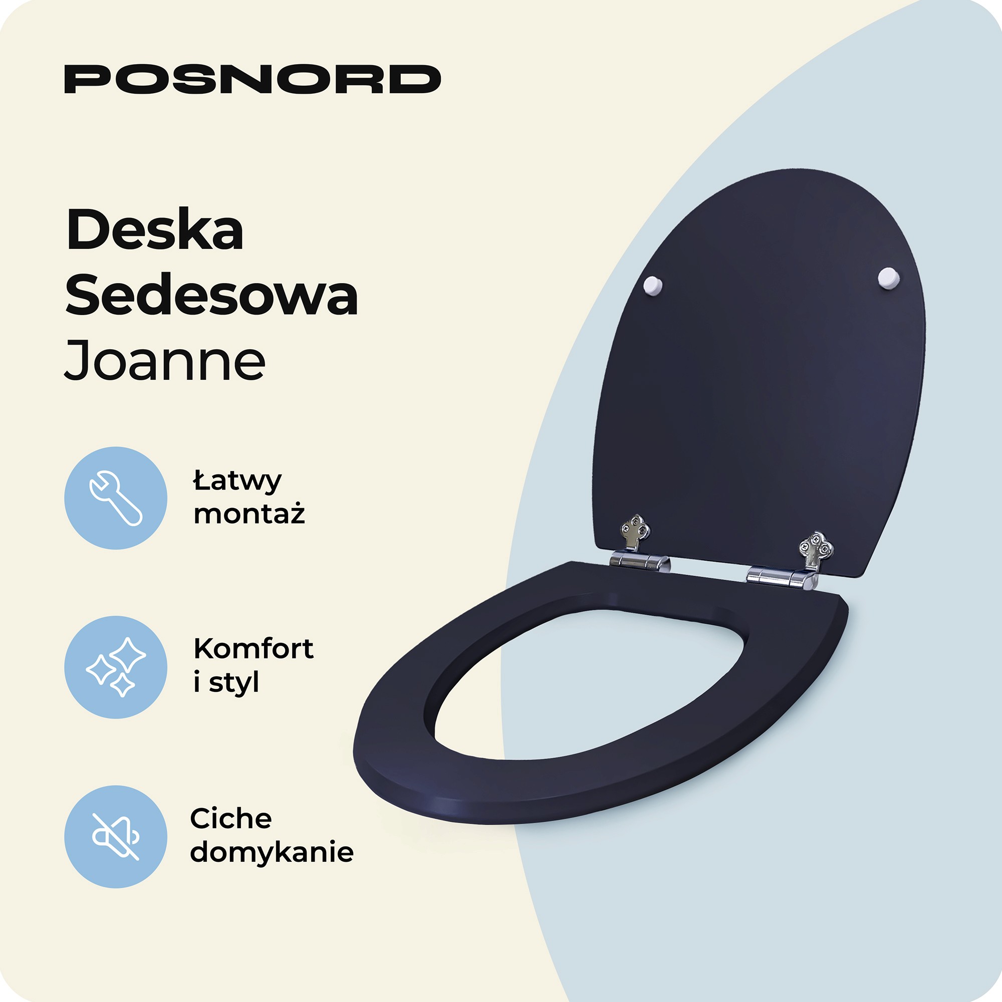 Deska Joanne z mechanizmem wolnoopadającym to praktyczne i bezpieczne rozwiązanie dla nowoczesnej łazienki. Dzięki zastosowaniu uniwersalnego systemu cichego opadania pokrywy, korzystanie z toalety jest wygodne i pozbawione nieprzyjemnego hałasu, a mechanizm chroni przed uszkodzeniami.